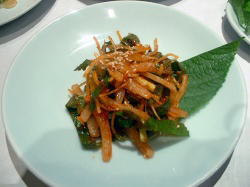 まずは、キムチ・水キムチ・ゴマ粥・どんぐりの寒天固めがでてきた。 ここのキムチは白菜の葉が厚く美味しかった。水キムチは、白菜だけではなくニラ・大根・ニンニクの芽が入っている。