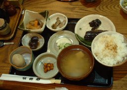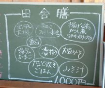 野菜ジュースは、緑黄色野菜が十種類入っている。(レタス・ほうれん草・パセリ・キャベツ・セロリ・ピーマン・にんじん・かぼちゃ・ブロッコリー・クレソンの十種類と、無臭ニンニク) 田舎膳は、きり干し大根・きのこおろし和え・揚げなすのからし煮・煮豆・温泉たまご・漬物・大豆味噌・かまど炊きごはん・みそ汁のセットである。 かまど炊きごはんは、大きなかまどで炊いたごはんで、おこげつきのごはんは、とても美味しい! 団子汁は、あっさりとした味噌味の汁に、団子が入っている。 団子汁