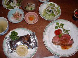 その後、目の湯(女性専用)と、露天の「川原の湯」へ入る。川原の湯は、すぐ傍らの川の流れを望むことができる。 旅館の前庭には、温泉プールがあるが、こちらには入らず。 今日の温泉巡りは、予定を終了し、途中「殺生石」を見学し、ペンション「山日記」へ向かった。ナビの指示に従って、進んでいくが、途中で道が細くなり、Uターンし大通りに戻る。パンフレットをよく見ると、所在地の緯度・経度が書いてあったので、再びナビを合わせて、午後5時に到着する。 殺生石 山日記(やまにっき)は、とてもアットホームなペンションで、客室も清潔で、オーナー夫妻の誠実さが伝わってくる。 早速、お風呂(ハーブ湯)に入り、さっぱりとする。 ペンション「山日記」 午後6時半から夕食 \(~o~)/ どらちゃんは冷酒、ともまるはビールを飲む。食事は、鮭のホイル焼き・ローストビーフ・ピザなど、どれも美味しくて大満足! 食事中に、オーナーの案内で、ペンションそばの小川で、蛍の幼虫、光るのが見えるということで、午後8時にみんながロビーに集まる・・・しかしオーナーがなかなか現れない。やがてオーナーが現れ「今日はとても気温が低い(9℃)ので、残念ながら蛍の幼虫が光るのを見ることができません」とのこと・・・蛍の幼虫が光るのが見えるか、事前に探していたそうだ。 部屋に戻り、暫くゆっくりしたのち、午後10時には就寝(笑)