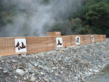 *仙人風呂 どこを掘っても温泉がわく大塔川を、流量の少ない冬の間だけ堰きとめて作る大露天風呂。一度に1000人が入れるほど大きいことからこの名がつけられた。プールのように広々としており、開放感も抜群。混浴で水着の着用OK。 次に、すぐ隣の渡瀬温泉の「大露天風呂」へ行く。約10分で到着。 ここの温泉は、「近畿地方最大の露天風呂」を売り文句にしており、どれくらいの大きさなのか興味津々で入る。 中には、内風呂に続いた、大きめな露天風呂があり、「それほど大きくないな」と思ったが、ふと見ると、「この奥にも露天風呂があります」の小さなふだを見つけ、奥へ行ってみた。 するとさらに露天風呂が3つあり、なるほど、これなら近畿最大かも・・と納得。