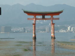 あなごの肝は、うなぎの肝よりも小さくて、苦味がなくて食べやすい。 あなご飯のあなごは、プリプリして、あっさりとしていた。 ご飯のボリュームがあり、とも全部食べきれず^^; 午後1時10分のフェリーで宮島へ向かう。途中、宮島の鳥居の写真をパチリ!