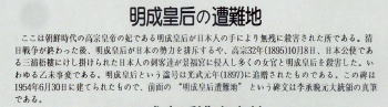 李王朝の栄華を伝える「勤政殿」や「慶会楼」などの華やかな建物を見学し、さらに奥の「香遠亭」まで足を運んだ。この奥に、1895年に日本の暴漢によって虐殺された明成皇后の退避場所があった。ここには、ほとんど観光客の姿は無く、景福宮の中とは思えないほどの静けさだった。 「明成皇后遇難之地」記念碑が、ぽつんと建てられており、ここにも日本侵略の重い歴史があることを知った。