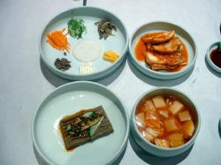 まずは、キムチ・水キムチ・ゴマ粥・どんぐりの寒天固めがでてきた。 ここのキムチは白菜の葉が厚く美味しかった。水キムチは、白菜だけではなくニラ・大根・ニンニクの芽が入っている。