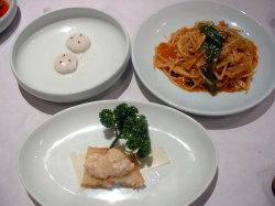 続いては、牛肉・サラダ・フカヒレのスープがでてきた。サラダは洋からしのドレッシングだった。 さらに、チヂミ・ヘムルチヂミ(海鮮チヂミ)・チャプチェ(春雨と細切り野菜あえ)と続く。