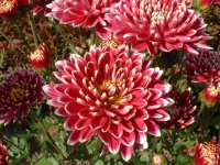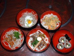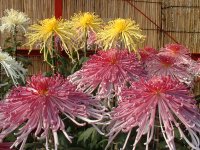 ここの人気「雷神 ミックス」を食べる。 雷神ミックスは、五段重ねで、山菜うどん・てんぷらうどん・きんぴらそば・とろろそば・そば寿司の5種類の味を楽しむことができる。 ともまるのお勧めは、とろろそば。そば寿司は、見た目はご飯のお寿司に似ているが、食べるとやっぱり、そばだぁ〜(笑) 食事を終わった頃には、店内は大勢のお客さんだった。 12時20分に出発し、今日の一番の目的である「富弘美術館」へ向けて出発する。 しかし、どらちゃんが、雑誌を見て「高津戸峡」へ行きたいというので、まずそちらへ立ち寄る。 午後1時に到着。ここの「ながめ公園」でちょうど関東菊花大会が開かれており、さっそく入る。 公園内には、いろいろな種類の菊が展示されており、その美しさと種類の多さにビックリ! ともまるは、いろいろな菊を写真に撮る パチリ