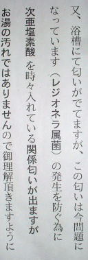 | ここは、温泉ではないのだが、展望浴室と呼ぶだけあり、恵那峡のすばらしい景色を眼下にすることができる。 施設は、新しく綺麗だった。 脱衣室に、右のような張り紙がしてあった。温泉でも、カルキ臭がするところが多い中、このような説明をしているのは、良心的。 実際にお湯に、入ってみたがほとんど、カルキ臭はしなかった。(有名な温泉でも、もっとカルキ臭がひどい所もある。) (2001.3.4) |