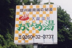中央自動車道、飯田ICより国道151号経由、阿南町新野(国道418号)を経て、天龍温泉「おきよめの湯」へ